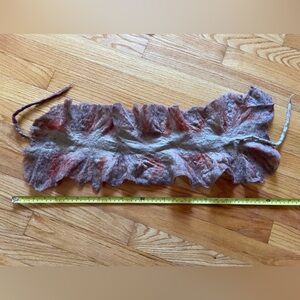 Beautiful unique handmade wet felted scarf made with a mix of rust or flesh tones, purple and ivory colored merino wool. The wool is from South America where it’s processed, dyed and melded together to create an unmatched color scheme.