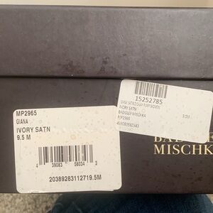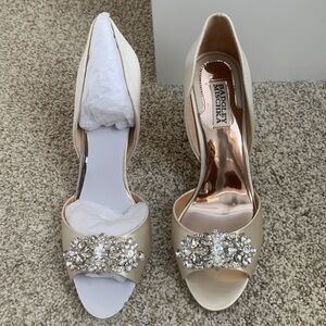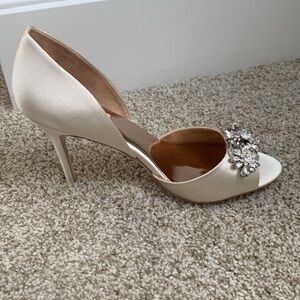 Badgley Mischka size 9 1/2 special occasion heels, ivory satin, new and unworn. Beautiful shoes with rhinestone details. In original box with original paper stuffing. Excellent condition. Perfect for special occasions including wedding, holiday, prom, homecoming, party.