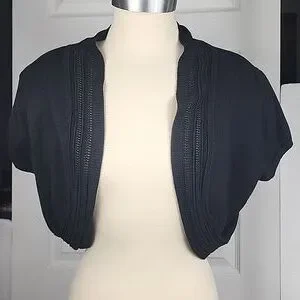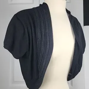 Say What? U S.A. Shrug Size L Short Sleeve Cropped. Very soft. Measuring 16 inches long on the back, 3 inch boarder 55% cotton 25% Rayon 20% polyester. Has a very small snag, see last picture, not at all noticeable but wanted to show it. #shrug #knitted #shortsleeve #black #Cardigan