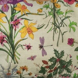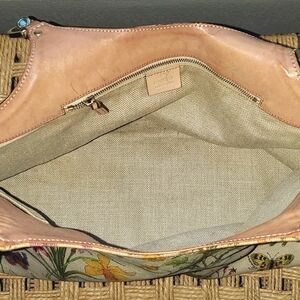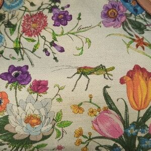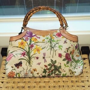 Beautiful Gucci Flora canvas bag with leather trim and bamboo handles. Features a floral motif along with butterflies, grasshoppers, and other bug friends.
