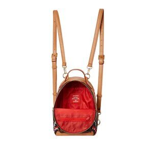 Honey brown Henny Air To The Throne small backpack from Sprayground featuring contrasting panel detail, checkerboard print, gold-tone logo plaque, front zip-fastening pocket, embossed logo to the front, single flat top handle, signature shark teeth detailing, all-around zip fastening, main compartment, full lining, detachable shoulder straps and gold-tone hardware.
