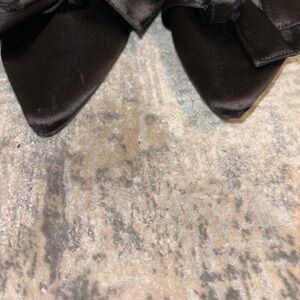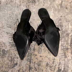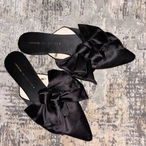 ZARA black satin slides with two bows. Simply gorgeous! Great for the holidays or with a pair of jeans and T-shirt. Good condition with a few small nicks on the toe of the toes.