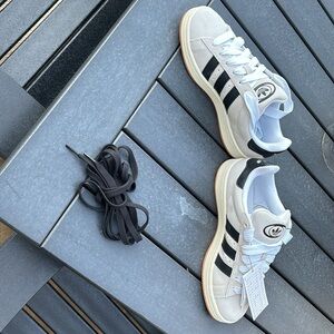 Brand new, never worn, tags attached, no stains. Size 7.5 us women sized adidas Campus 00s. Crystal white, core black, off white. Looted according to Adidas coloring description.