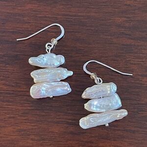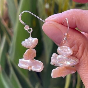 This is an absolutely gorgeous pair of natural Kashi pearl solid sterling silver hoop earrings. The pearls are pinkish cream in color and have a great luster / orient / shine. The earrings measure over 1.5 inches including their hoops. The hoops are made of solid sterling silver. They are stamped 925 for sterling silver on their hoops. New without tags.
