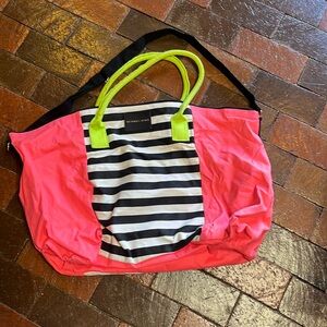 Victoria’s Secret tote is 24 inches wide by 16 inches high. Pink, lime, green, black and white very bright colors. Like new inside. Has some spots on outside (see photos).