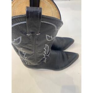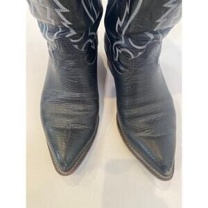 Tony Lama men’s black leather cowboy boots with white stitching. Heeled. Pointed toe. Pull on.