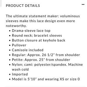 White House Black Market Drama Sleeve Lace Top Size M