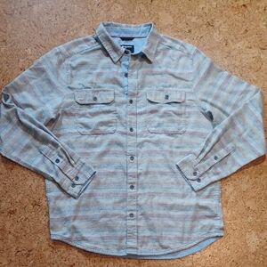 Quicksilver Limited Edition Stranger Things T in gray and black camo with Strange Surfing Patch on left chest, short sleeves, and notched hem. Armpit to armpit measures 25 inches, sleeves measure approximately 8.5 inches, and length measures 27 inches. Excellent used condition, no flaws.