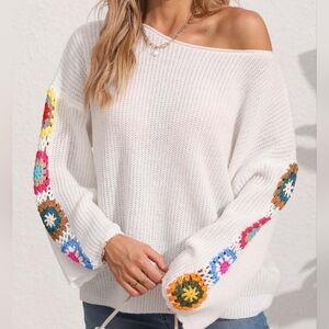 Colorful Crochet Flower Bohemian Long Sleeve Waffle Knit Shirt Oversized Retro Top