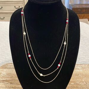 Vintage Silver Tone Red Blue White Beaded Triple Layer Strand Statement Necklace