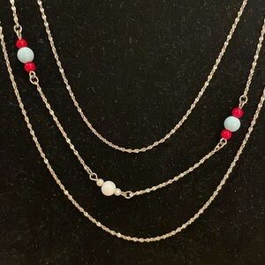 Vintage Silver Tone Red White Blue Beaded Triple Layer Strand Statement Necklace