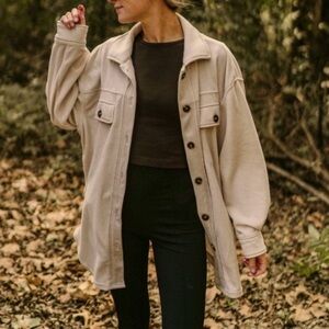 The perfect addition to your closet this Fall. Imagine throwing this on over your favorite t-shirt and flannel with a pair of jeans, then heading to a bonfire with friends. It is so soft to the touch! This collared jacket has buttoned chest pockets, side pockets, and long buttoned sleeves. It layers so well over so many outfits that you will reach for it over and over again and will be the perfect throw on and go layering piece in your closet.