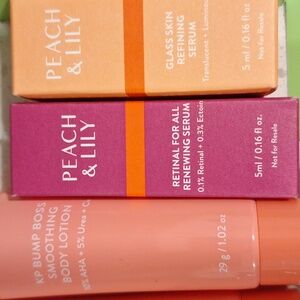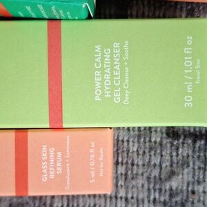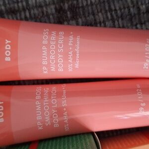 13 piece set. New-super oasis concentrated serum, Rescue party barrier comfort cream, Power Calm Hydrating Gel Cleanser deluxe sample, 3 Retinal for all renewing serums, Glass Skin Refining Serum deluxe sample, Glass Skin Face Polisher deluxe sample, 2 Matcha Pudding Antioxidants, sample power cocktail lactic acid repair serum, Cream KP Bump Boss Microderm Body Scrub deluxe sample and KP Bump Boss Smoothing Body Lotion deluxe sample.