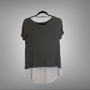 The brand is Wrapper. Itβs a grey, blue and grey floral blouse with ruffled neckline and sleeves. Empire waist elastic to define but bellows out.