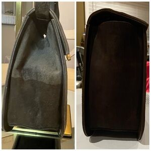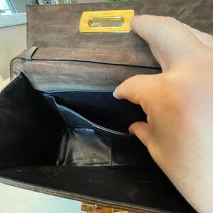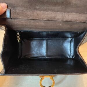I love this Ferragamo crossbody. It is suede, originally a khaki green color. The suede had some stains, so I dyed it a dark brown. Part of the suede lost its nap a little, but dying it really helped, and it looks so much better. You can see the before and after photos in the listing. Open her up to find a zipper pocket to keep small things organized. I really liked this when it was green, but the dark brown adds such a touch of class. This truly is a beautiful bag!