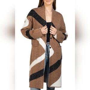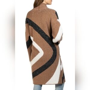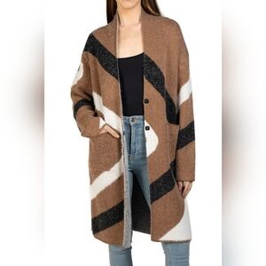 Look like a fashionista in this chic, collarless, long cardigan sweater that features a pretty print, snap closures, and two open-front pockets.