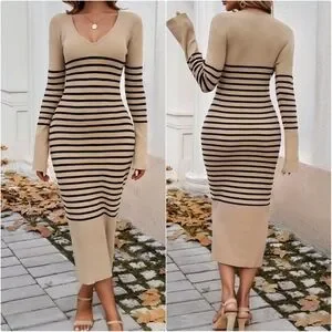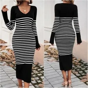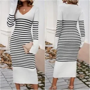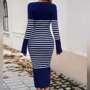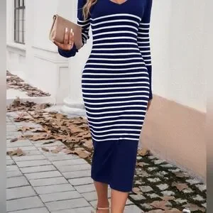 Striped Navy V-Neck Sweater Dress