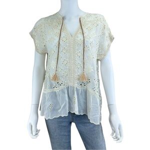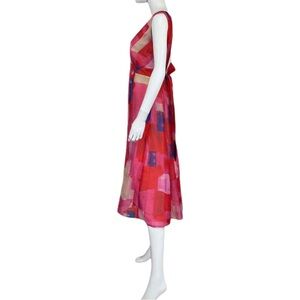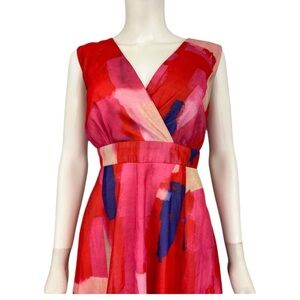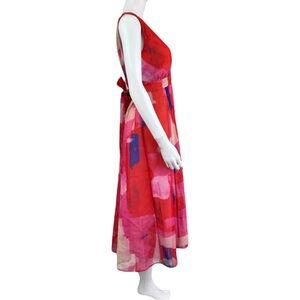NEW with Tags! Eva Franco dress (sold by Anthropologie) featuring an abstract watercolor print with hues of pink, red, blue, and cream. This dress also features a v-neckline, belted waist, and a maxi length depending on height.