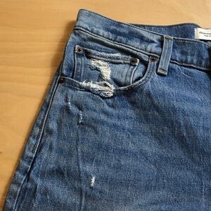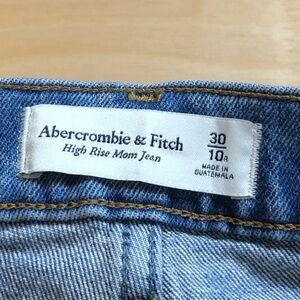 Abercrombie & Fitch high rise mom jean women or men size 30/10 blue button closure pockets ripped casual workwear travel all season 99% cotton 1% elastane material used good condition see the photos more details smoke free home offers welcome daily shipping.