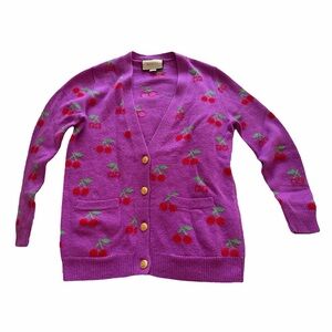 For sale: Gucci top in purple with short sleeves and a turtleneck, made from 100% wool. It’s a women’s size XS with measurements of 29.75” bust, 26.25” waist, and 21.75” length. There are small holes under both armpits that can be easily sewn, and the price reflects this flaw. Still a great designer piece for anyone looking for a stylish addition to their wardrobe at a discounted price.