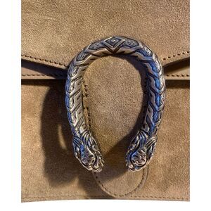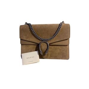 Channel your inner goddess with the Gucci Medium Dionysus Chain Handbag in Beige Suede. This exquisite handbag features the iconic tiger head closure, a symbol of strength and power. The beige suede exterior adds a touch of elegance, while the antiqued silver-toned chain strap adds a modern and edgy flair. With its medium size, this handbag offers both style and functionality for any occasion.
