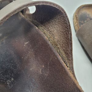 They show natural signs of wear and the straps are slightly separating from the footbed but can be glued back together. See photos. Lots of life left. Does not come with the original box.