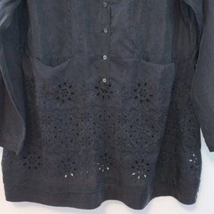 This is a VERY NICE Vintage Johnny Was 100% Silk Button Tunic Top. Absolutely no flaws and in terrific pre-loved condition. Size M (measurements are in photos). Features front pockets, partial button front, long sleeves, machine washable, floral embroidery cut-out design. Gorgeous with jeans or flowy linen pants.