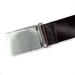 A classy plain brown belt from Banana Republic in the late 90s that ends with a nice, silver sliding buckle so adjustments are made easy. The buckle that has "Banana Republic" engraved on the side has a small scrape on it but otherwise in good condition as is the leather. Measures 1.5" wide, it's a size 34" with an overall length of 41".