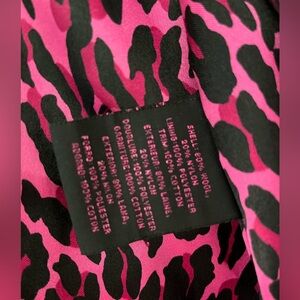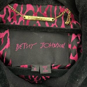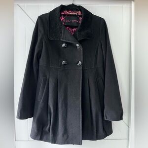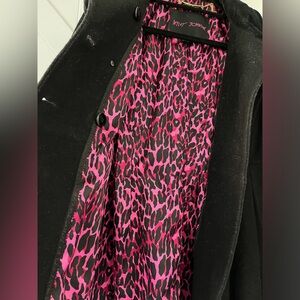 Gorgeous wool blend black pea coat from Betsey Johnson with velvet collar and hot pink leopard print lining. Size 8. All original buttons with extras included.