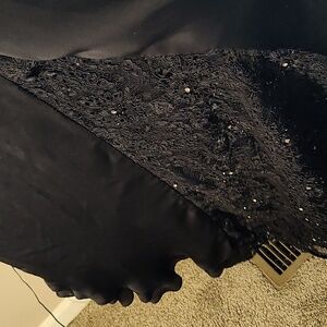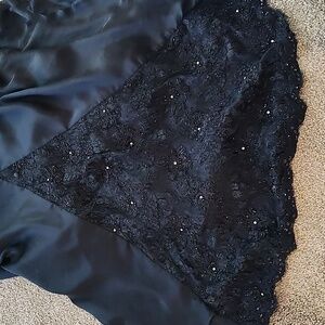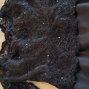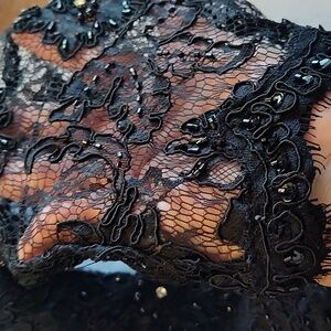 This dress is beyond beautiful. Perfect 3/4 length lace sleeves. Panel bottom. Hook on back to lift short train.44 inches shoulder to front hem. 23 nches pit to pit. Black rhinestone lace top.