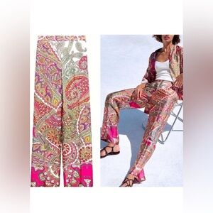 ZARA Satin Faux Silk Twill Red Pink Blue Paisley Scarf Print Button Up Shirt