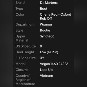 NWT Dr. Martens 1460 Lace Up Vegan 7 Cherry Red Combat Boots