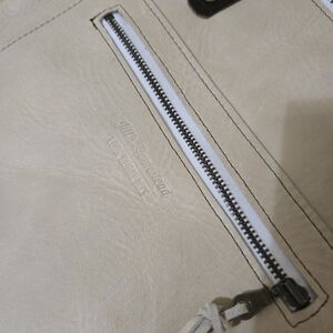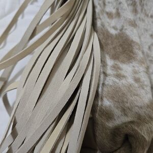 Sleek cowhide, cream leather with fringe. 2nd owner but never carried by me.