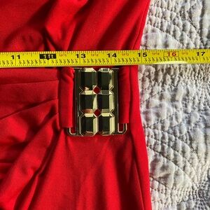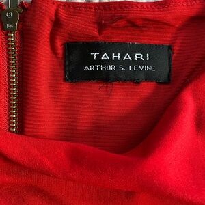Beautiful red Tahari dress. Pre-loved. Good condition. Size 8. See photos for measurements. Gold buckle at waist. Dress has nice stretch.