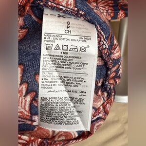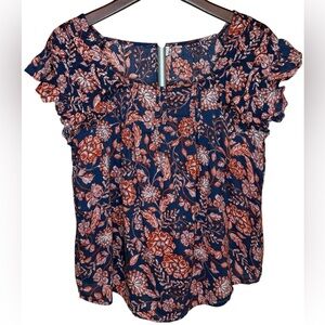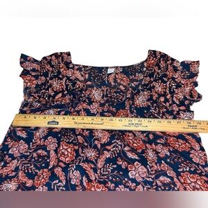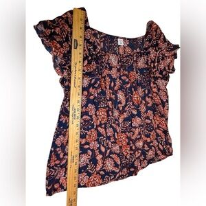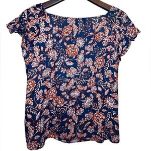 Old Navy cap sleeve floral top in shades of navy, white and orange. Lightweight and comfy. Easy to wear everyday, on vacation, at work and beyond.