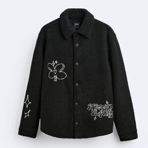 Zara Black Embroidered Faux Shearling Streetwear Utility Overshirt Size L/XL