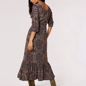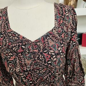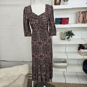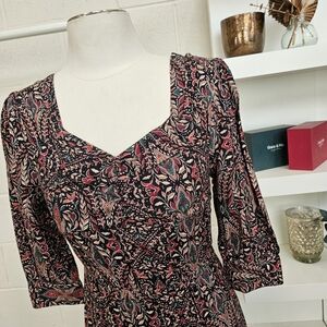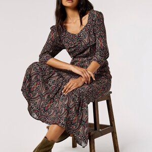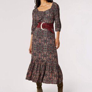 This midi pairs a timeless paisley print with a fit and flare shape designed to create a flattering silhouette. Crafted from soft, woven fabric, it features a sweetheart neckline, three-quarter-length sleeves, and a tiered hem. COMMENT WITH COLOR REQUESTED WHEN PURCHASING: BLUE OR BURGUNDY