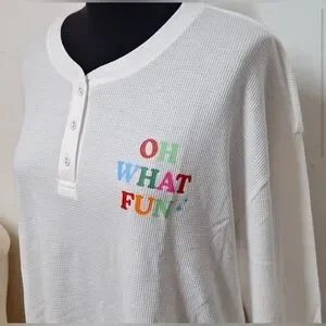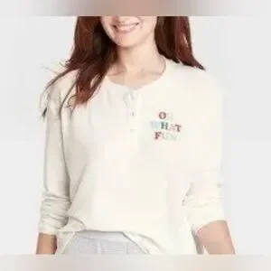This pajama top includes a long-sleeve pajama shirt featuring the message "Oh What Fun" in multicolor hues on a cream background. Boasting a thermal construction, this top offers you all-night comfortable