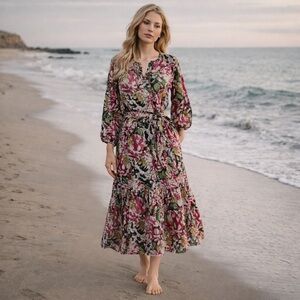 Hand embellished with beads, sequins and rhinestones that fall like morning dew drops on a sheer black