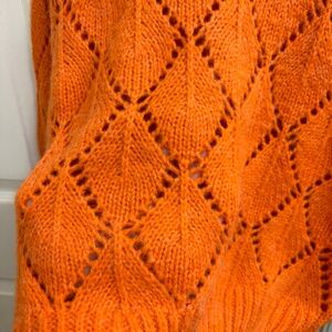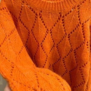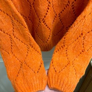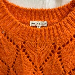 Moon River women's crewneck sweater in size small (S). It has an open-knit design in a vibrant orange. It has a slight oversized fit; please see the measurements below.