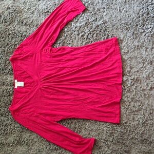 This eye-catching, merlot-colored blouse pairs perfectly with your best jeans! The red is a blue-red as opposed to an orange-red. The blouse features 3/4 sleeves and slight runching in the front. Top has no marks, stains, or tears.