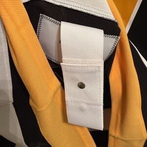 Authentic tie-down fight strap attached to inside lower back. Back neck taping. Debossed details on shoulders. Enhanced team crests with dimensional embroidery. Heat-sealed chrome NHL Shield at front collar. Mesh inserts. Sewn-on stripes. Sewn-on tackle twill letters and numbers.