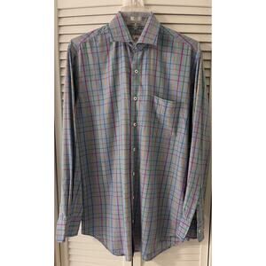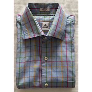 Peter Miller Men's Dress Shirt M Light Blue w/Orange/Red/Green Criss Cross A+