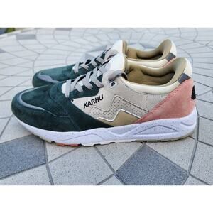 NIB: Finland's "Aria Silver Birch" an exotic mix of tones across the Aria, a stylish combination of birch green & June bug are found on the soft pigskin suede & textile uppers/ lace up design/ mesh underlays/ mono sock collar/ injected molded midsole/ rubber outsole by Karhu. In excellent intact condition. **Disclosure: the laces are not the originals.