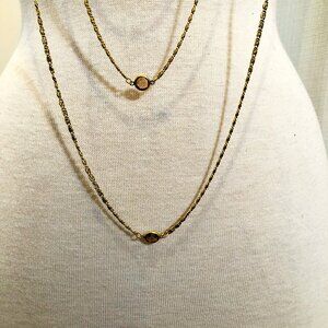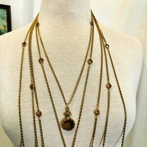 Dramatic gold tone multi strand necklace from circa the Sixties. Gold tone in color with five novelty chains that get progressively longer as the necklace goes lower. The first and second chains have interesting pendants. One is made of glass and has an intaglio vibe with a cameo / silhouette carved into a smoky-topaz-rose colored glass in an elaborate round setting. The second pendant is a swiveling oval gold tone piece with a coin face on one side and some hieroglyphs on the other--- this one can actually be removed with the clip-clasp it hangs from. Each chain has little round smoky-topaz-rose colored glass circles set within its length. Back of the neck hinge clasp. In good vintage condition. Manufactured by Goldette and most likely designed in New York and made in Rhode Island, U.S.A. Incredible piece that can add great style to your look!