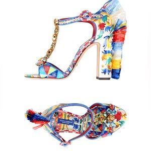 Vibrant multicolor sandals with bold patterns. Features a chunky heel and decorative chain. Perfect for a statement look.