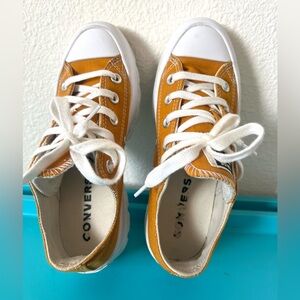 Pre-owned in excellent condition. Platform low top canvas sneakers. No flaws. Women's Size 5.5/22.5cm. Unisex. Gingersnap/Yellow/Mustard color.