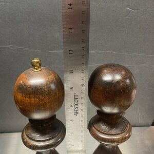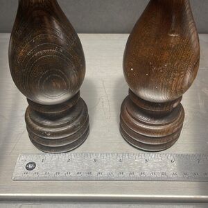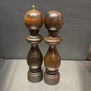 Dark wood salt and peper shaker grinder preowned in great shape. One is a grinder. One is regular about 2 inches wide each and about 11 inches tall.