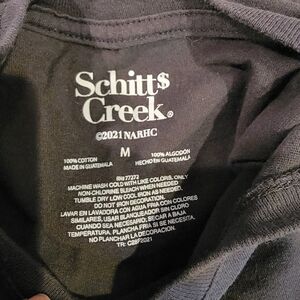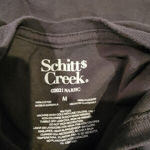 Schitt$ Creek women's Medium tshirt in dark grey with white writing and tan flowers on the front. Gray shirt is 100 % cotton. Some wear but in great condition.