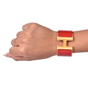 This is a chic cuff bracelet from Hermes that is classic yet very modern. This bracelet is a wide band of plated rose gold inlaid with pink (Rose Candeur) enamel. The hinge on one side and opens with an Hermes "H" on the prominent side. This is a marvelous bracelet for a one of a kind look from Hermes!. It is a very rare, bold and exciting accessory to add to your collection. It is brand new, never worn just tried on. It would look great with your Birkin, Kelly, and. Picotin Handbag! It comes in a box.